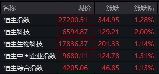 港股三大指数高开高走,截至发稿,恒生指数涨1.28%,报27200.51点,突破27000点大关,恒生科技指数涨2%,报6594.87点,国企指数涨1.31%,报9680.11点。