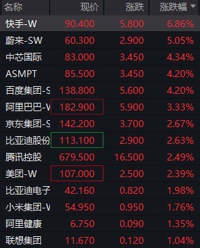 大型科技股中,阿里巴巴-W涨3.33%,腾讯控股涨2.49%,京东集团-SW涨2.67%,小米集团-W涨1.76%,美团-W涨2.39%,快手-W涨6.86%。